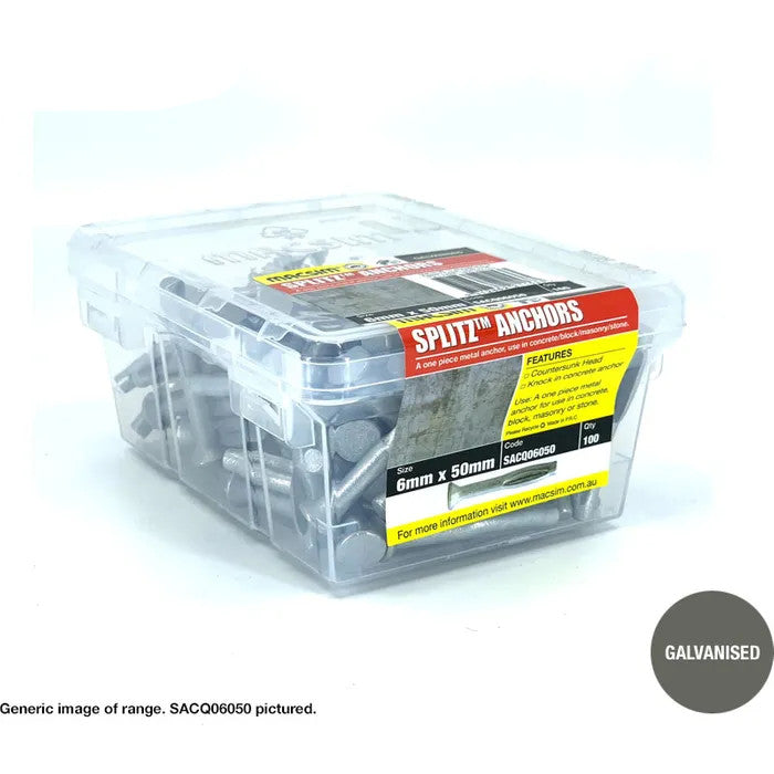 Macsim Countersunk SPLITZ Anchor Galvanised - metric size x length x Box quantity