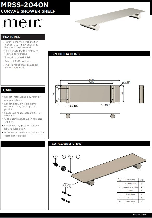 MEIR Curvae Shower Shelf 400mm - Various Colour Finishes