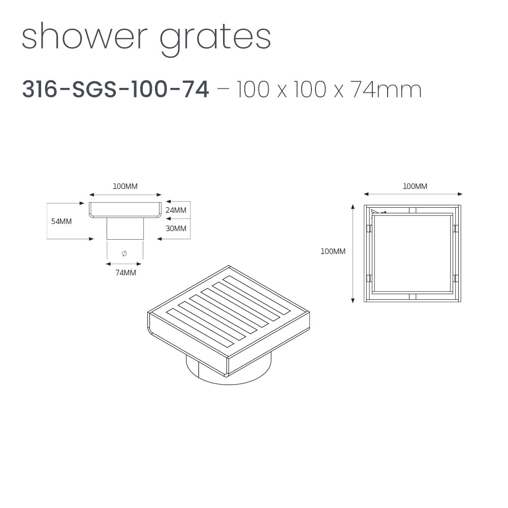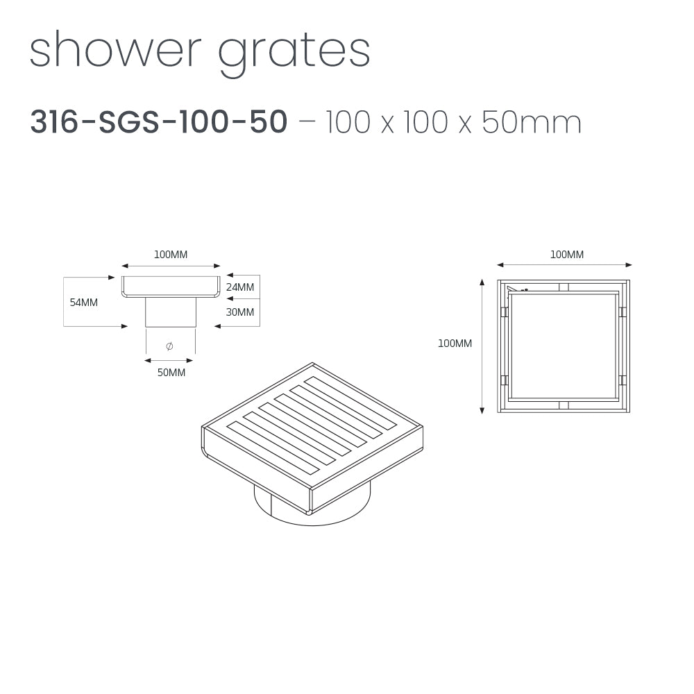 Radiant 316 Stainless Steel Square Patterned Floor Waste 100mm x 100mm x Outlet Diameter