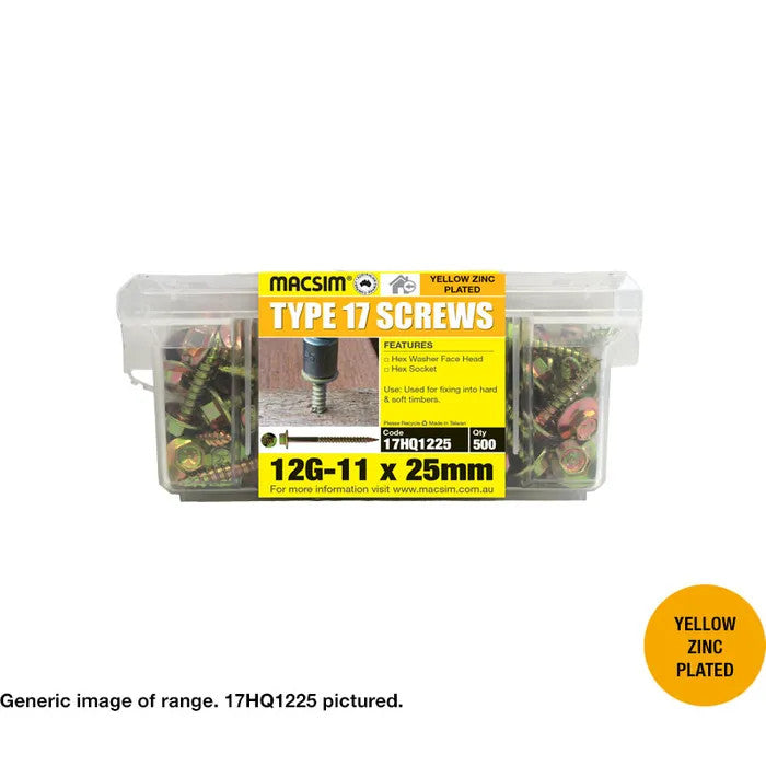 Macsim Type 17 Hex Head Yellow Zinc screws - gauge x length x box quantity