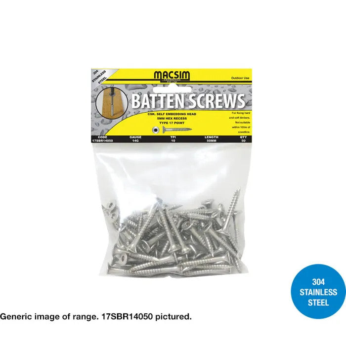 Macsim Type 17 Batten Hex Drive 304 Stainless Steel screws - 14G x length x box quantity