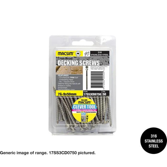 Macsim Type 17 TRIM Head Square Drive 316 Stainless Steel decking screws - gauge x length x box quantity