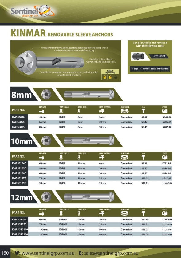 - The Kinmar Unique Removable Drive Socket is required for installation or removal of these Removable Sleeve Anchors