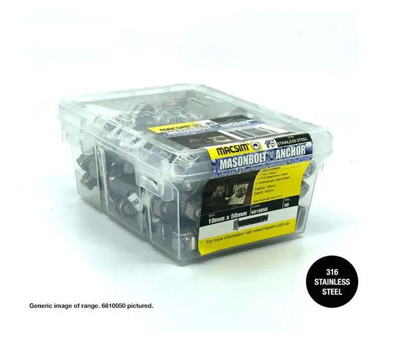 Macsim Hex Head MasonBolt / AnchorBolt 316 Stainless Steel - diameter x length x box quantity