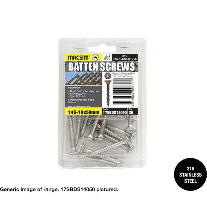 Macsim Type 17 Batten Hex Drive 316 Stainless Steel screw - 14G x length x box quantity