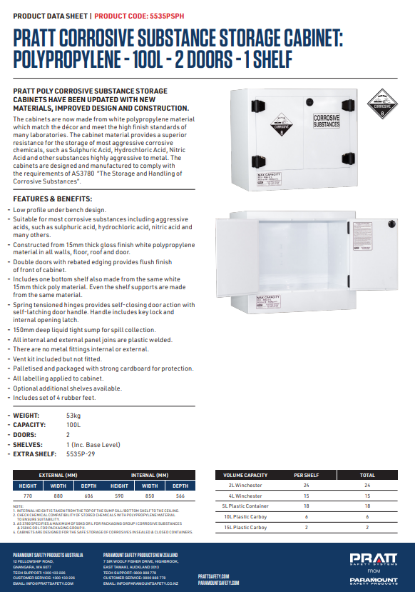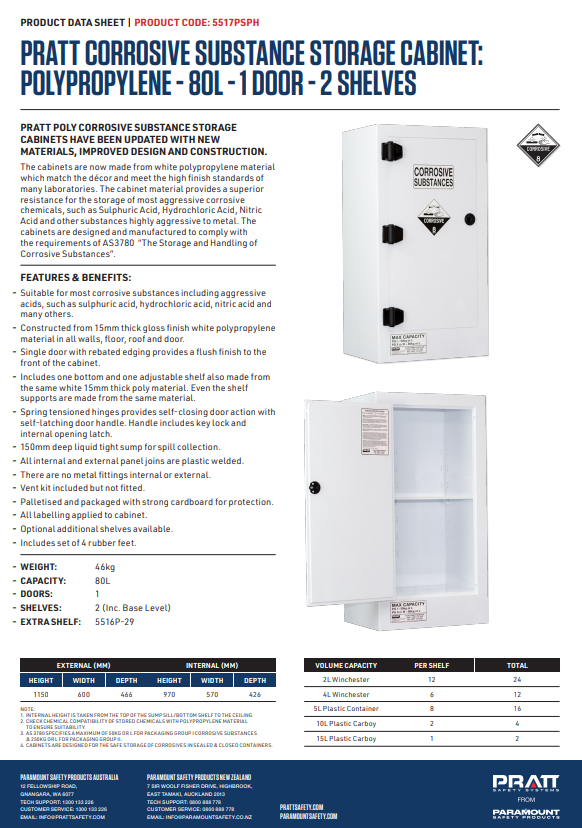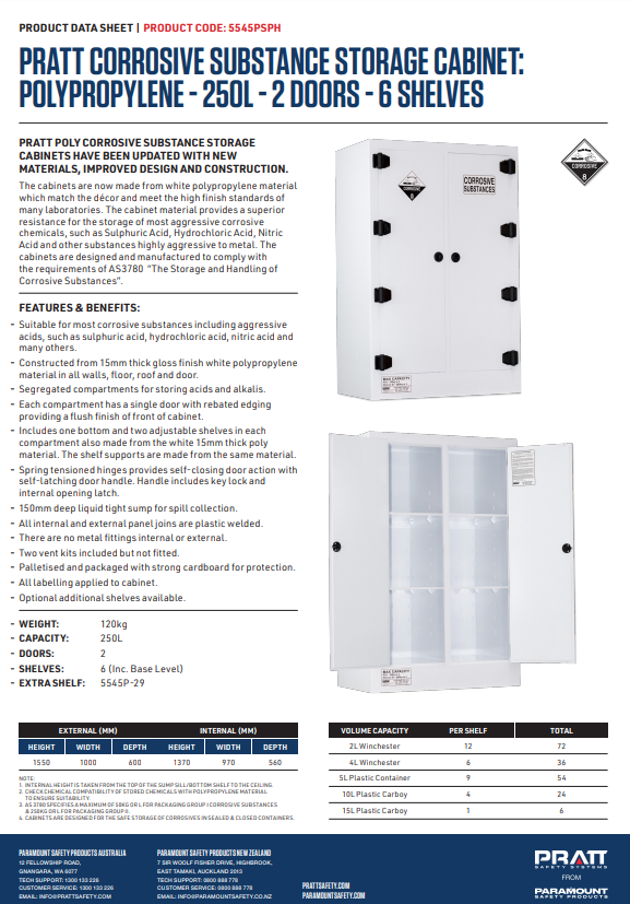 Pratt Class 8 Corrosive Substance Storage Cabinet Polypropylene - Various Door Shelf Combinations