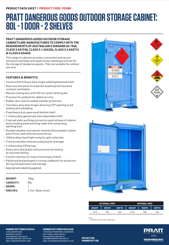 PRATT DANGEROUS GOODS OUTDOOR STORAGE CABINETS ARE MANUFACTURED TO COMPLY WITH THE REQUIREMENTS OF AUSTRALIAN STANDARD AS 1940, CL ASS 3 AS1940, CL ASS 5.1 AS4326, CL ASS 5.2 AS2714 & CL ASS 6 AS4452.