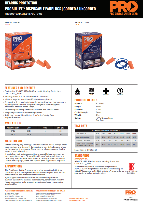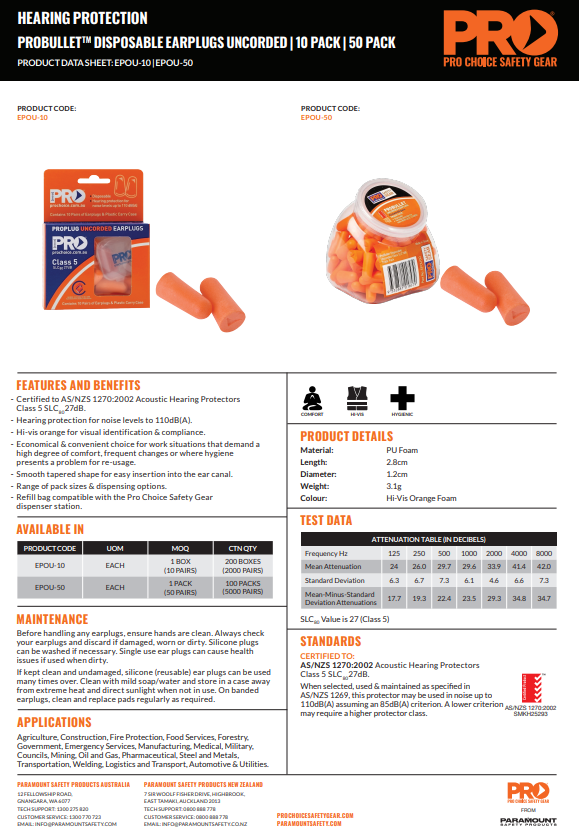 Pro Choice earplugs meet stringent Australian safety standards, ensuring the highest level of hearing protection. The range includes disposable foam options, corded foam earplugs, and reusable silicone varieties, catering to diverse needs in industrial, construction, and recreational settings.