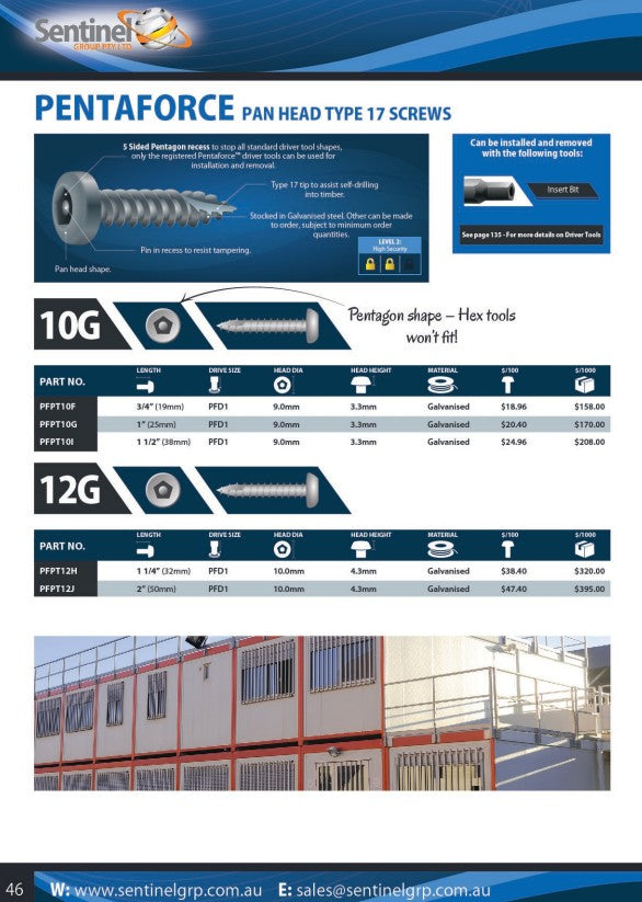 To ensure the highest level of safety, the Pentaforce tooling range from Sentinel is a registered tool, controlling the availability of these specialised screws. As part of the security process, users must complete documentation of their purchase with Sentinel to become registered users of the Pentaforce driver tools. Trade Warehouse will assist in completing this documentation, which users are required to forward to Sentinel.