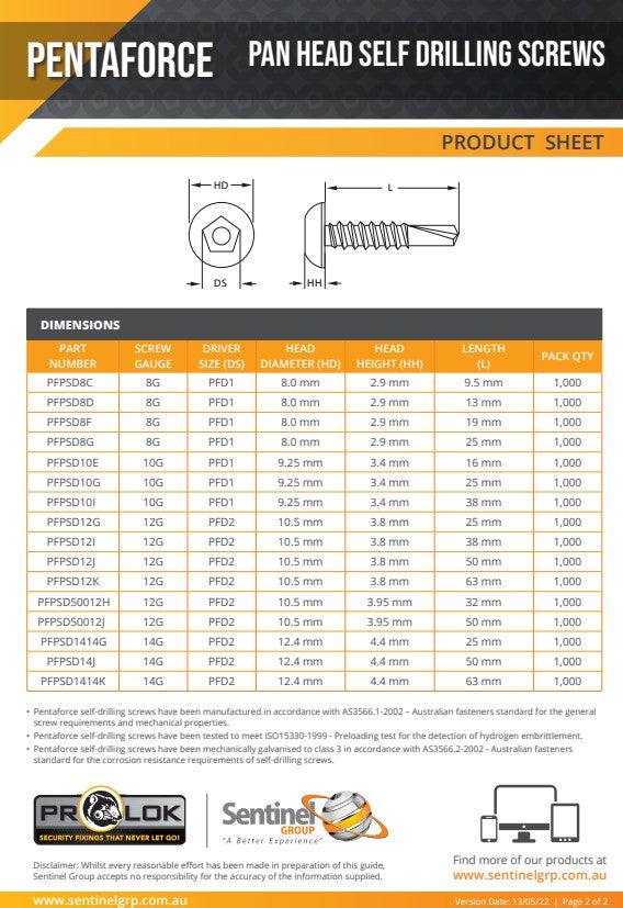 Pentaforce Pan Head Series 500 Self Drilling Galvanised Screw 12G Box of 1000 - in 2 Length Options