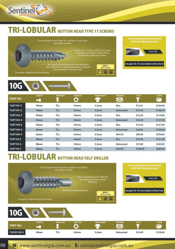 Introducing the unique Tri-Lobular security screws, exclusively available through Prolok and one of the most popular security screws, renowned for their exceptional security features and versatility: Often used on security screens, doors, playground equipment and for the sign industry.