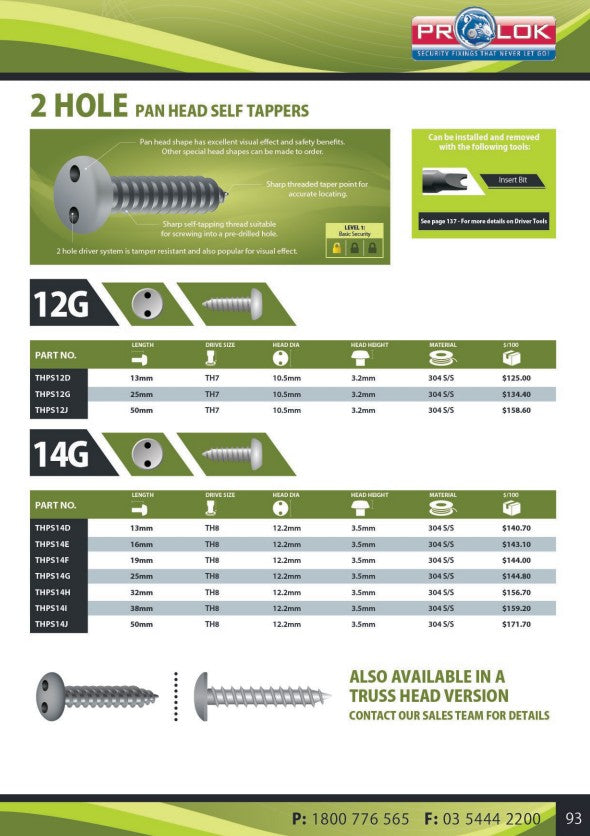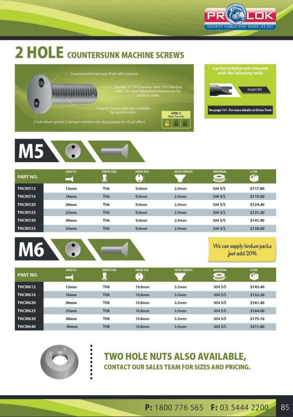 Introducing theTwo-Hole security screws, exclusively available through Prolok, this range of screws features a visually appealing finish, making them ideal for applications where screws are prominently visible. Designed for low to medium torque applications, they combine aesthetics with functionality Available in multiple dimensions, ensuring you find the perfect fit for your project.