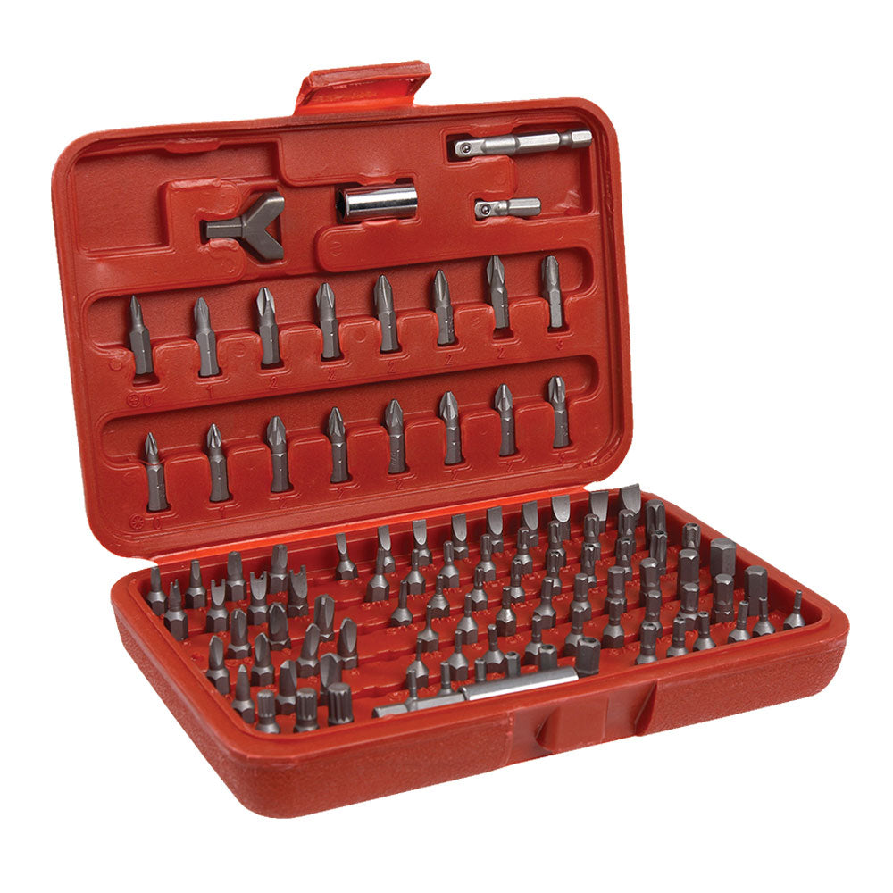 The ultimate 100 piece kit with a variety of driver styles in various sizes including Resytork, Torx, Pin Hex, Two Hole and Tri-Wing insert bits. All in a convenient snap lock case with clear marking to show where each bit rests.