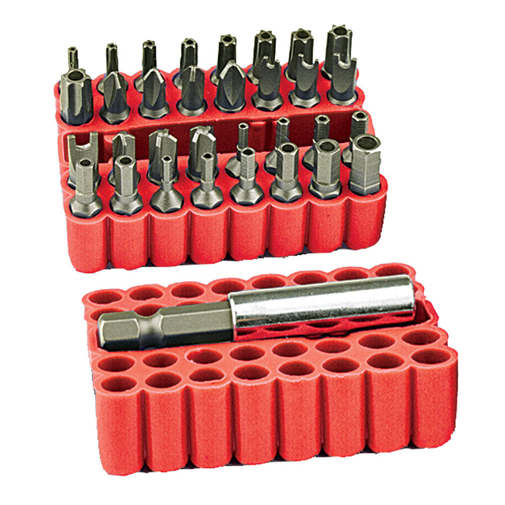 A 33 piece kit housed in a handy plastic holder with a variety of driver styles in various sizes including Resytork, Torx, Pin Hex, Two Hole and Tri-Wing insert bits. Great for the toolbox or workbench.