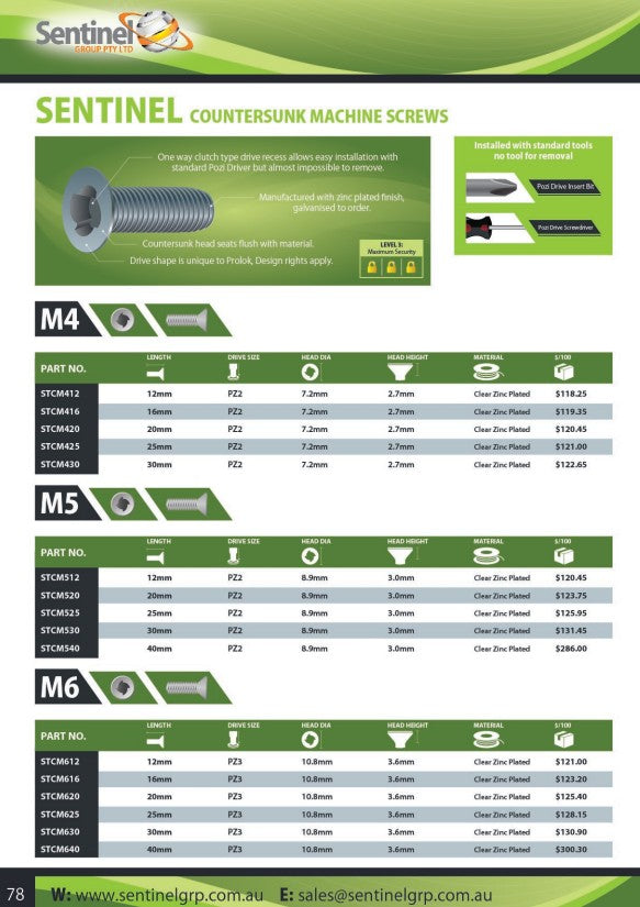 Sentinel Countersunk Head Zinc Machine Screw - metric size x length - Box of 100
