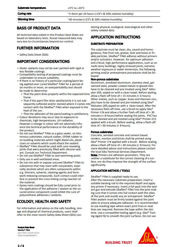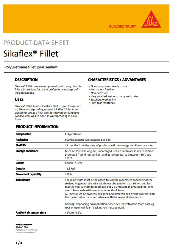 Sikaflex®-Fillet Joint is specifically designed for integration within Sika's waterproofing systems. It serves as an effective fillet joint sealant for movement junctions, such as wall-to-wall and wall-to-floor connections, in waterproofing applications.