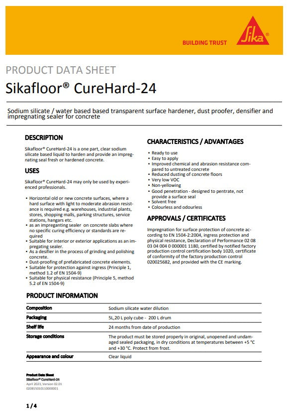 A one part, clear sodium silicate based liquid to harden and provide an impregnating seal fresh or hardened concrete. Horizontal old or new concrete surfaces, where a hard surface with light to moderate abrasion resistance is required e.g. warehouses, industrial plants, stores, shopping malls, parking structures, service stations, hangars etc.