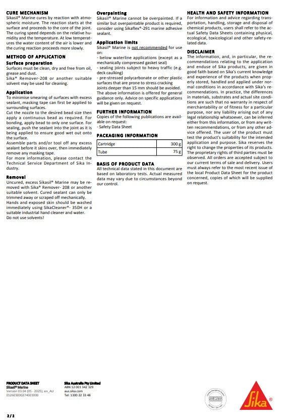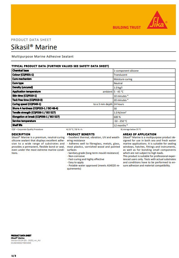 Sikasil® Marine is a high-quality, neutral-curing silicone sealant designed for superior adhesion across various materials, ensuring a durable and flexible bond even in harsh marine environments. It offers outstanding resistance to heat, vibration, UV exposure, and weathering. Compatible with fibreglass, metals, glass, many plastics, varnished wood, and painted surfaces, it is sanitary grade with long-term mould resistance and non-corrosive. This fast-curing sealant is easy to apply and approved for potable water use, meeting AS4020 standards.